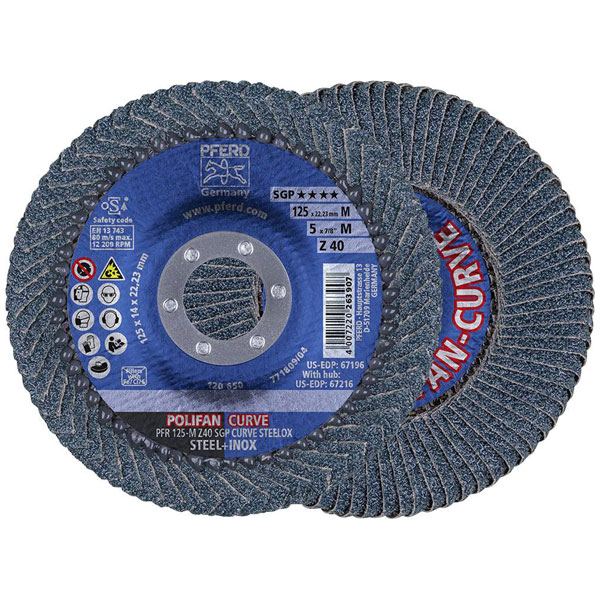 The PFERD 69398197 PFR 125-M Z 40 SGP CURVE STEELOX flap disc has a diameter of 125 mm and comes in a pack of 2 pieces. It features an abrasive pad mount for efficient grinding and finishing tasks. This flap disc is typically used for processing steel and stainless steel surfaces.