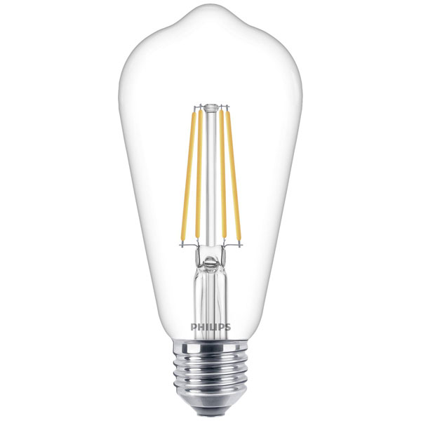 Philips Lighting produces the Classic LED bulb, model 76305300, designed in a special shape for an E-27 socket. This energy-efficient bulb consumes 7 W while providing the equivalent brightness of a 60 W incandescent, emitting a warm white light. Ideal for household or decorative lighting, it fits standard fixtures with its dimensions of 6.4 cm by 14 cm.