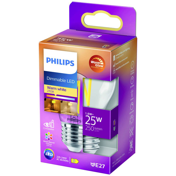 Philips Lighting's 871951432419000 LED bulb offers a warm white glow with a teardrop shape, measuring 45 mm in diameter and 78 mm in length. This energy-efficient bulb, equivalent to a 25 W traditional bulb, consumes only 2.5 W. Ideal for creating cosy atmospheres, it is perfect for home or decorative lighting applications.