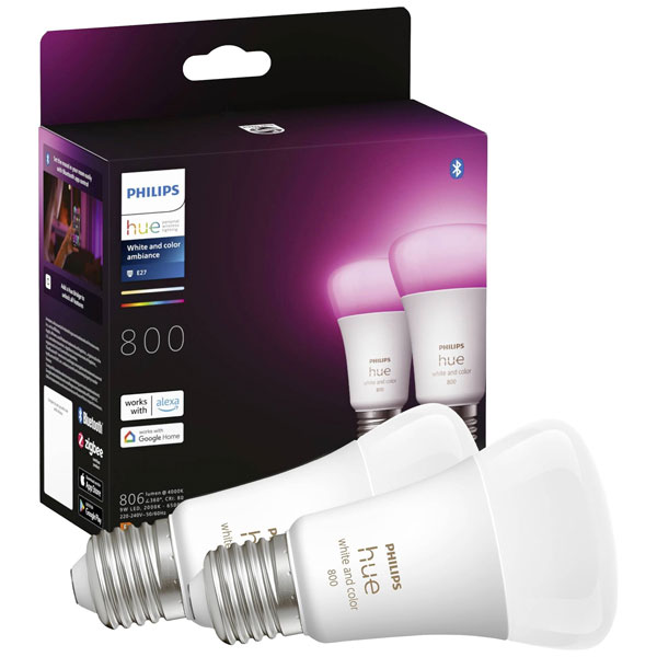 Philips Lighting offers the Hue White & Colour Ambiance E27 LED light bulbs, providing adjustable white to cool white lighting. These 9 W bulbs feature wireless and remote control capabilities, delivering 570 lumens each, suitable for creating various atmospheres at home. Ideal for energy-efficient lighting needs, they integrate seamlessly with smart home systems.