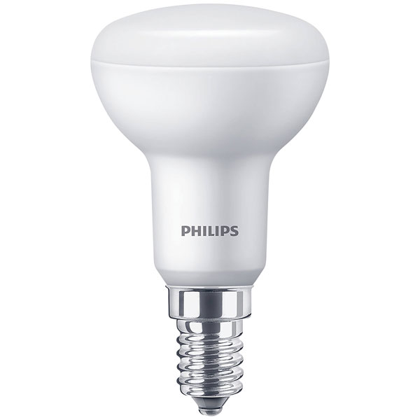 Philips Lighting's LED (monochrome) reflector bulb, model number 871951437192700, offers a warm white light equivalent to a 60 W bulb while using only 6 W of power. This energy-efficient, E14 base bulb, measuring 50 mm in diameter and 86 mm in length, is ideal for domestic lighting applications, providing focused illumination. Its compact size and efficiency make it suitable for use in various settings such as reading lights, accent lighting, or small lamps