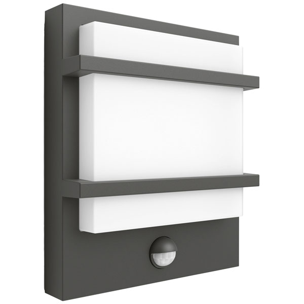 Philips Lighting offers the Petronia LED outdoor wall light, featuring a motion detector and monochrome LED with a 3.8 W power output. This anthracite fixture is ideal for enhancing security and ambiance in garden or outdoor areas. The product is recognised for energy efficiency and modern design.