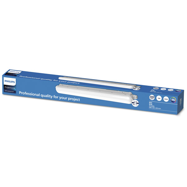 Philips Lighting manufactures the ProjectLine Wet Room Light, an 18 W LED that provides neutral white illumination. It's designed for environments such as basements, lavatories, and garages. The light is ideal for wet room applications, offering durable and safe lighting solutions.