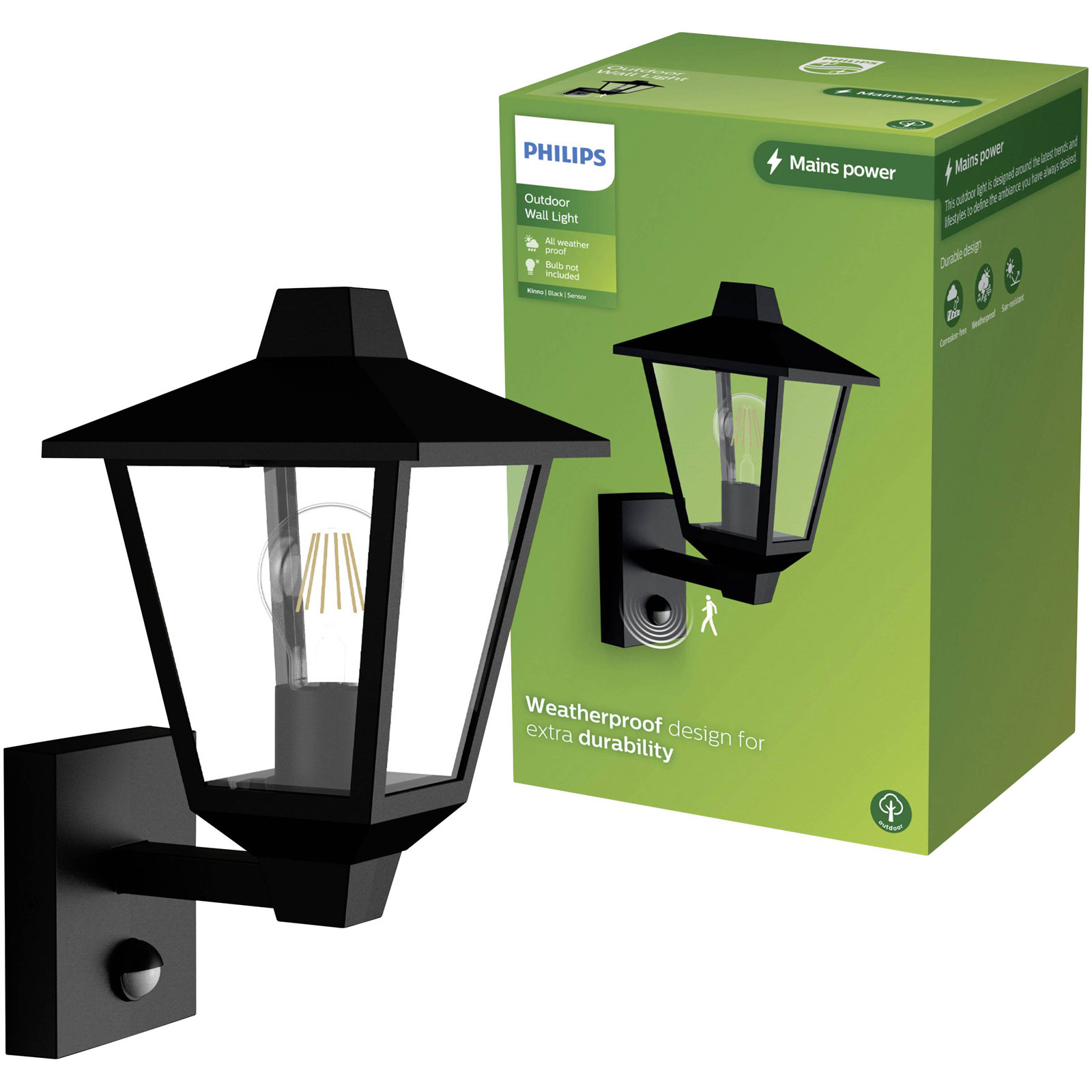 Philips 929004141401 presents the Kinno Outdoor Wall Light, engineered to provide efficient and durable outdoor lighting solutions. This product, designed for use with an E-27 light bulb, serves as a robust element in exterior environments such as gardens, patios, and entranceways. The Kinno features black fittings, ensuring seamless integration with various architectural styles while offering resilience against harsh weather conditions. Engineered for reliability and long service life, the Kinno is suitable for residential and commercial applications where consistent outdoor illumination is essential. This wall light supports the incorporation of Philips technology, contributing to energy efficiency and reduced maintenance requirements.