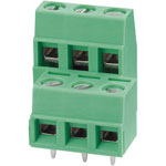 Double decker 13.5A PCB terminal blocks from Phoenix Contact with low height design, staggered floors and housing tapping for wave soldering. Multiple blocks can be aligned to increase the number of positions available.