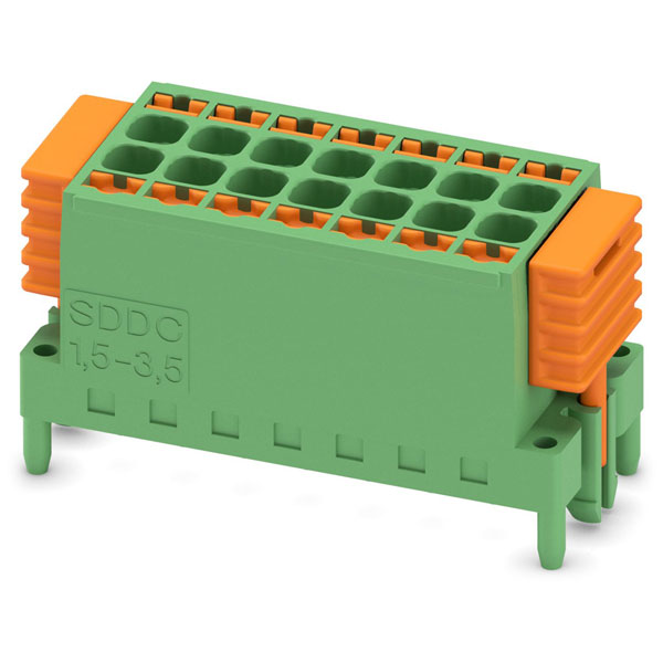 Phoenix Contact's pin housing PCB SDDC features a total of 14 pins with a contact spacing of 3.50 mm. This component is ideal for connecting printed circuit boards in various electronic applications. It is commonly used in industrial automation systems and electrical panels.