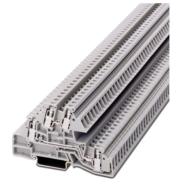 The Phoenix Contact Three-Level Installation Terminal Block 32A 6.2mm (W) is equipped with 4 connections and has been designed with two external wire connections. Other types in the PIK range support all other circuit versions encountered in practice. For example, combining the PIK 4-PE/L/NT and the PIK 4-L/L enables a three-phase circuit to be wired on a design width of 12.4mm. This represents a space saving of 18.6 mm compared to conventional wiring with single-level installation terminal blocks.