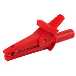 High quality fully shrouded red crocodile clip from PJP which includes a finger guard and complies with IEC1010 Category 2 safety requirements.