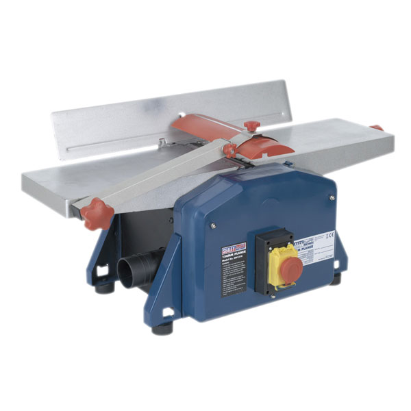 Portable power planer with heavy-duty cast base for accurate and smooth planing. Accurate fence tilts between 45° and 90°. Fitted with two blades capable of planing timber up to 150mm wide. No-volt release switch prevents uncontrolled re-start after power interruption. Dust extraction port with collection bag. Adjustable cutting depth up to 3mm.