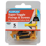 Plasplugs® Super Toggle Fixings with expanding wings, which spread load over a wide area. Ideal for overhead applications, especially for lathe, plaster and plasterboard. Typical applications: wall clocks, shelving units, wall cabinets, bathroom cabinets. Adjusts to grip different wall thicknesses from 10 to 15mm.