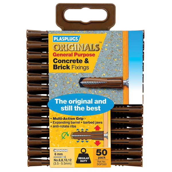 Plasplugs Originals™ General-Purpose Fixings are regular-duty, suitable for concrete, brick, breeze block and stone. The plugs feature multi-action grips, expanding barrels, barbed jaws and anti-rotate ribs.