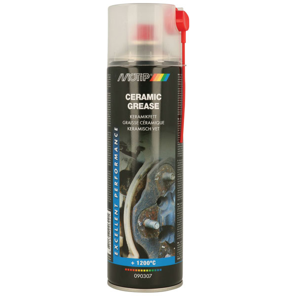 MoTip Pro Ceramic Grease Spray offers excellent adhesion, to treat parts which are liable to heavy workload and/or which are exposed to very high temperatures. Prevents wear and sticking. Protects against electrolytic corrosion and has high thermal stability. Ceramic grease is resistant to chemicals, weather influences, water, salt, weak acids and bases. Fitted with a directed jet spray.