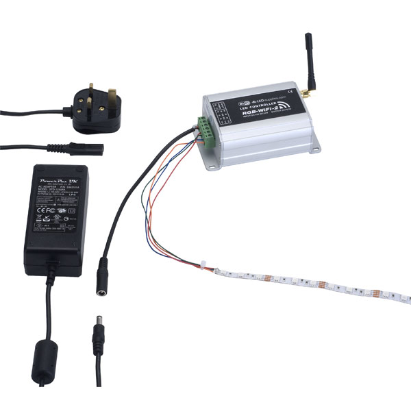 The Wi-Fi controller can be used to control any single colour, colour temperature adjustable or RGB LED lighting application that uses a 12 to 14V DC power supply. The system can be quickly and easily set-up and the device software to be able to use the system can be downloaded from either iTunes, the Apple or Android app store. Search on iTunes or Google Play for WIFI-102. Contained in this kit is a wireless controller, 5m of RGB LED tape with 150x 14.4W RGB LEDS, a 90W power supply with mains lead and a power supply to controller connecting cable.