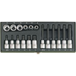 Set includes: 6 screwdriver bits 5mm to 14mm in standard (55mm) version; 6 screwdriver bits 6mm to 14mm in extra long (100mm) version; 6 double hexagon inserts 9mm to 21mm.
