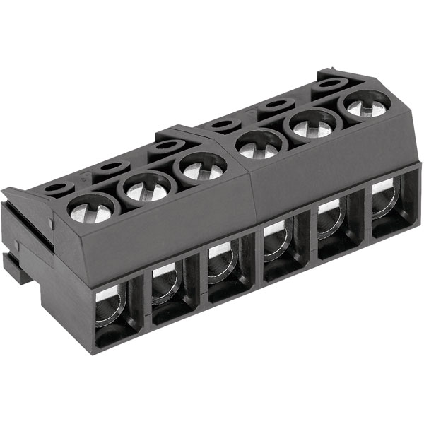 Plug-in 8A screw terminal with wire protection from PTR, 5.0mm pitch, with 6 poles. Can be used alongside pin strips.