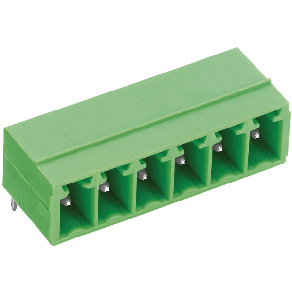 Green horizontal 9A PCB connector from PTR, with 3.5mm pitch and 6 poles.