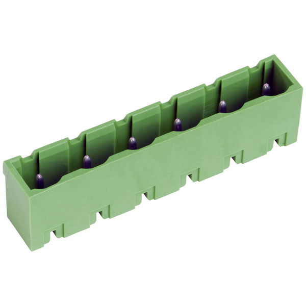 The PTR Hartmann pin housing PCB is a six-pin, vertical multi-pin connector with a contact spacing of 7.62 mm. It is green and identified by the manufacturer's part number 50960065121D. This component is typically used in electronic circuitry for connecting PCBs in industrial and consumer electronics applications.