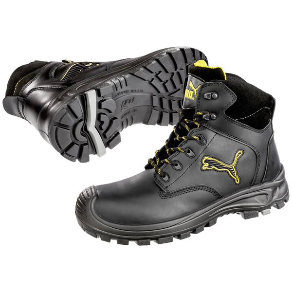 Puma safety work boots, model 630411-40, feature a black and yellow design in EU size 40. These S3 safety boots offer robust protection suitable for challenging workplace environments. Commonly used in construction, industrial, and manual labour settings, they provide both comfort and safety.