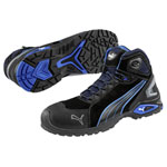 PUMA 632250-43 Safety work boots are designed for workplace safety, featuring a durable black and blue structure suitable for demanding environments. These S3 graded boots offer reliable protection and comfort for various industrial applications. Ideal for construction sites and warehouses, PUMA's Rio Black Mid ensures safety and durability with every step.