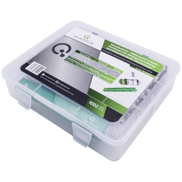 Quadrios 1811P029 is a resistor set comprising 1000 metal film resistors, each designed to deliver reliable performance with a power rating of 0.5 watts and a precision tolerance of 1 percent. These axial lead resistors are characterised by their excellent stability and low noise, attributes that make them ideal for high-fidelity audio applications, precision instrumentation, and other scenarios where accuracy and reliability are paramount. With an impedance type well-suited for a variety of electronic circuits, the Quadrios 1811P029 provides consistent resistance across its components, ensuring effective operation within demanding engineering environments. This set is identified with the code 04260573961405 and is perfect for both prototyping and production environments, offering engineers a dependable solution for managing electrical resistance in their projects.