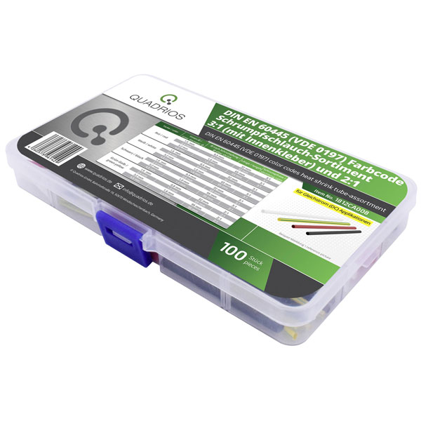 The Quadrios heatshrink set includes 100 parts in multiple colours such as black, red, white, and green-yellow. It offers shrinkage ratios of 3:1 and 2:1, allowing for versatile electrical insulation and protection. Typical applications include bundling cables, repairing insulation, and providing corrosion resistance in electrical connections.