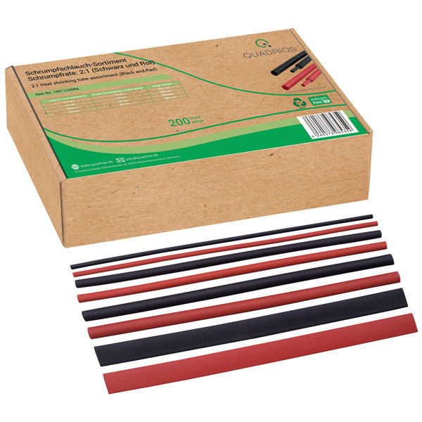 The Quadrios 19011CA094 heatshrink set contains 200 black and red pieces with a 2:1 shrinkage ratio. Manufactured by Quadrios, these versatile heatshrink tubes are ideal for insulating and protecting electrical connections. They are commonly used in automotive, electronics, and general electrical applications.