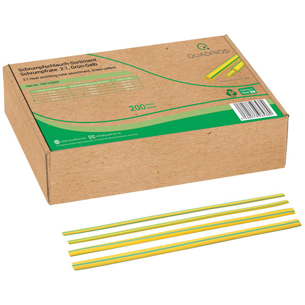 The Quadrios 19011CA097 heatshrink set provides a 2:1 shrinkage ratio in green and yellow. It includes 200 parts ideal for insulating and protecting cables. Commonly used in electrical and automotive applications, it is designed for easy application by professionals and hobbyists alike.