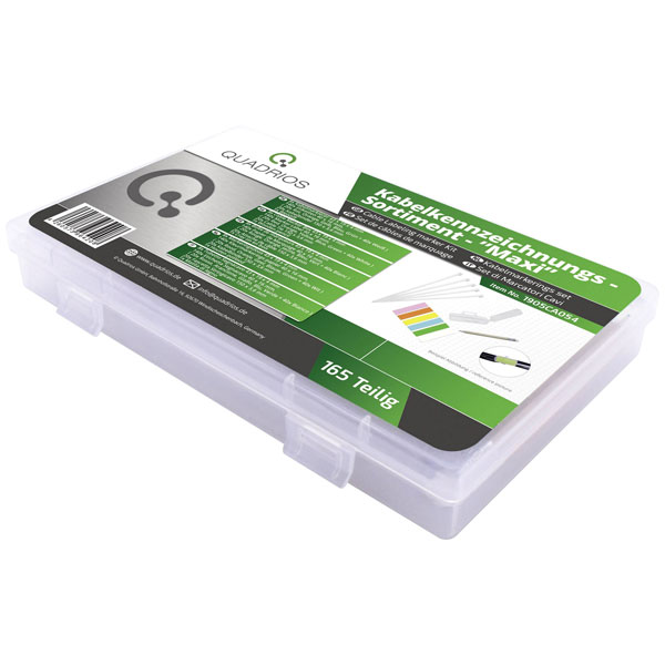 The Quadrios 1905CA054 cable marker set includes 165 transparent cable ties with a writing area of 40 x 16 mm, ideal for user-defined labelling. These industrial labels are particularly useful in cable processing and EMC applications, enabling efficient organisation and identification. Manufactured by Quadrios, this set is designed for robust labelling solutions in various industrial environments.