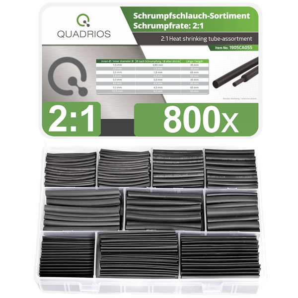 Quadrios is the manufacturer of the 1905CA055 heatshrink set. This set includes 800 pieces of black heat shrink with a shrinkage ratio of 2:1. It is typically used for insulating wires, providing strain relief, and bundling cables.