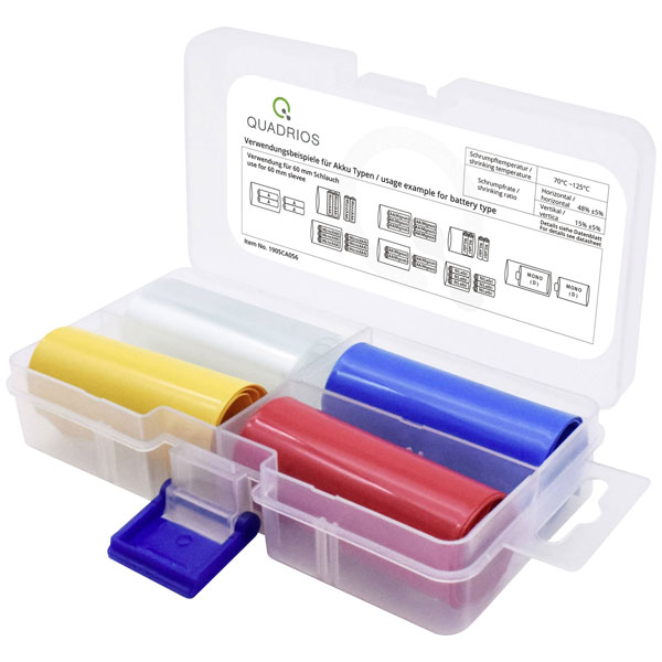 Quadrios 1905CA057 Battery heatshrink without adhesive is available in transparent, blue, yellow, and red, and offers a 2:1 shrinkage ratio with dimensions of 36 mm and 19 mm. This heatshrink is useful for insulating and protecting battery packs, wires, and electronic components. Ideal for use in electronic repairs and enhancements, the heatshrink provides a customised and professional finish.