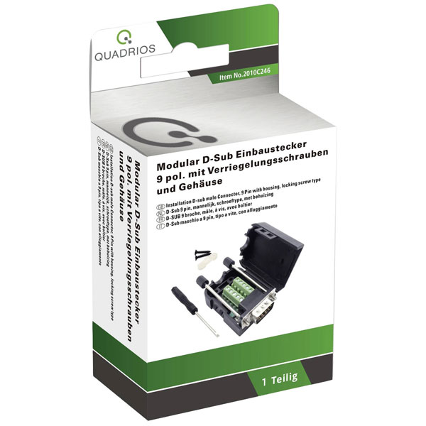 The Quadrios 2010C246 D-SUB socket features a 9-pin configuration and comes with a set of screws, making it suitable for reliable and secure connections. This D-sub connector is commonly used in computer interfaces and telecommunications equipment. Its robust design ensures durability and consistent performance in various electronic applications.