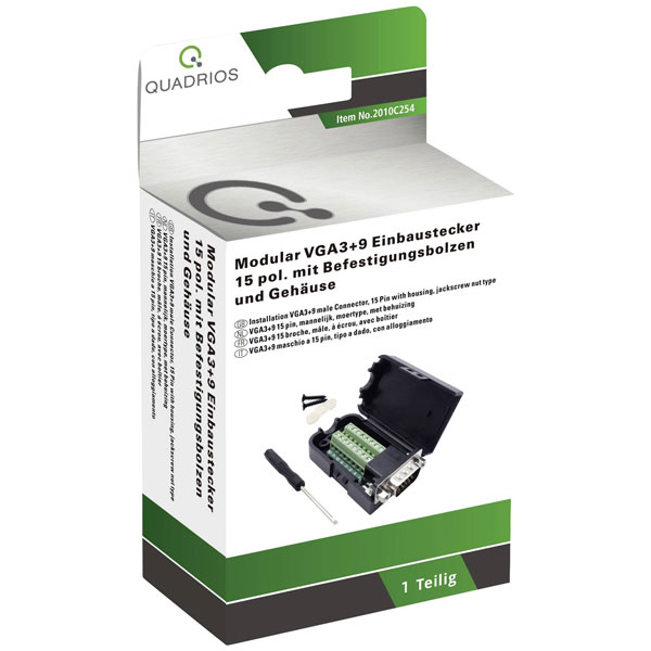 The Quadrios 2010C254 VGA connector is a straight plug with 15 pins, offered in black as a complete set. Manufactured by Quadrios, it is ideal for connecting video displays to computers. This connector is commonly used in office and home environments for video display applications.