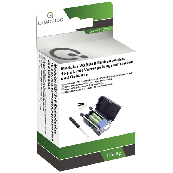 The Quadrios 2010C257 VGA connector is a black, straight socket featuring 15 pins. Manufactured by Quadrios, this set is ideal for establishing video connections in computing applications. Typically used in monitors, projectors, and graphics cards, the connector ensures reliable signal transmission.
