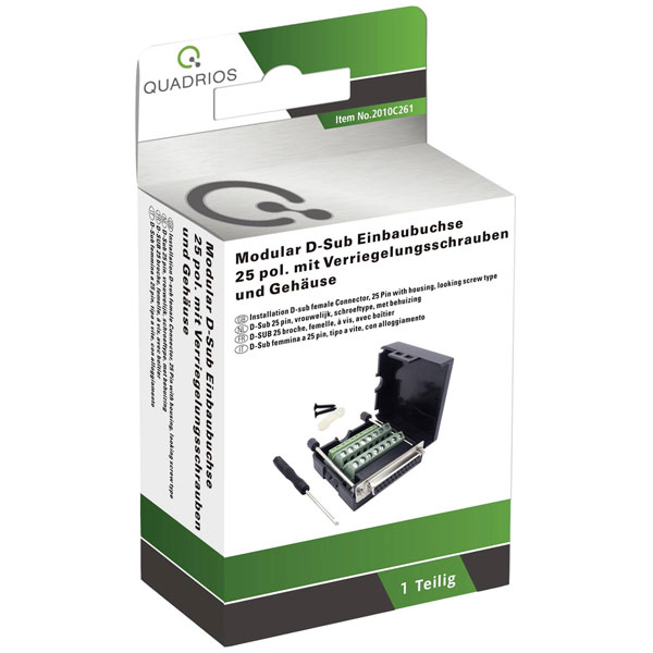 The Quadrios 2010C261 D-SUB socket features a 25-pin configuration with screws included in the set. This D-sub connector is ideal for establishing reliable connections in computer and telecommunications equipment. Its robust design ensures durability and secure installations.
