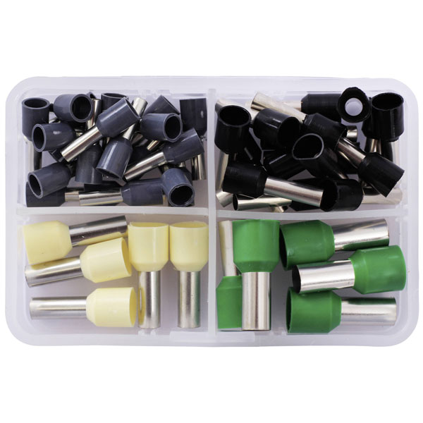 The Quadrios 2010C394 Ferrule set includes 45 partially insulated ferrules in sizes from 4 mm² to 16 mm². This ferrule set provides reliable connections for electrical applications, enhancing wire integrity and safety. It is typically used for crimping and securing stranded wires in terminal blocks or electrical panels.