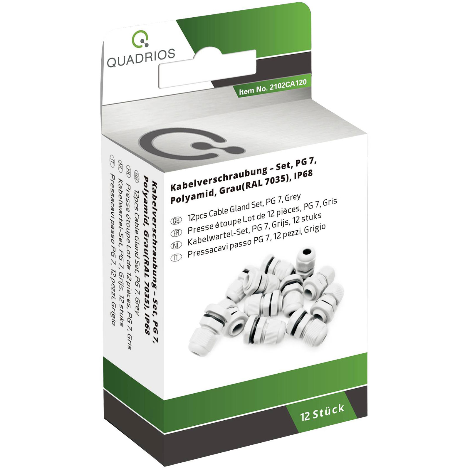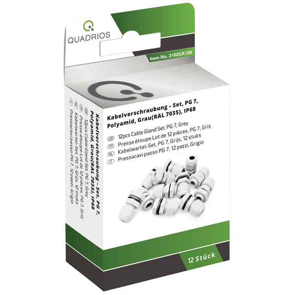 The Quadrios 2102CA120 Cable gland set is manufactured by Quadrios and comes in a light grey colour. Made from durable PA66 material, it features a PG7 connector. This set is typically used for securely routing cables in electrical enclosures or junction boxes.