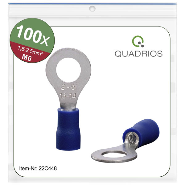 The Quadrios 22C448 Ring Terminal is a partially insulated, solder-free connector with a cross-section capacity of up to 2.5 mm² and a hole diameter of 6.5 mm, perfect for secure electrical connections. Its blue insulation indicates suitability for standard automotive applications, making it a reliable choice for car crimp terminals. This set is particularly useful for m6 ring terminal and other similar applications requiring robust, reliable crimping.