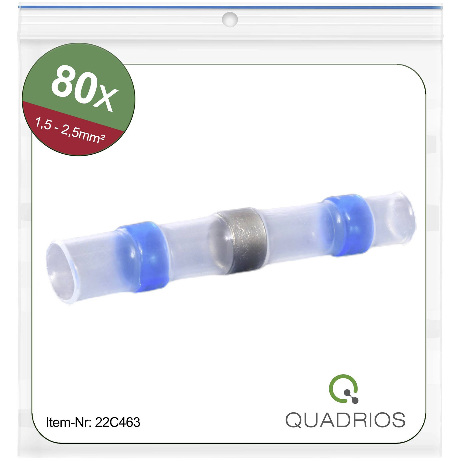 The Quadrios 22C463 is a blue insulated butt joint crimp connector suitable for cables sized 1.5 mm² to 2.5 mm². It features heatshrink capabilities, ensuring secure and insulated connections. Typical applications include electrical wiring tasks where dependable and insulated connectivity is essential.