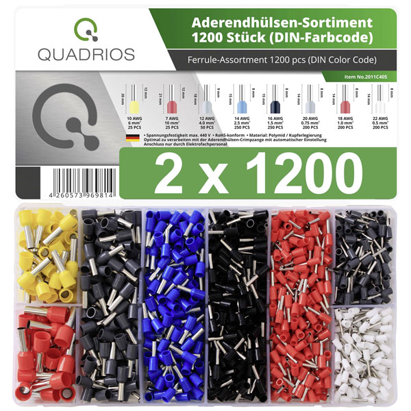 The Quadrios 22C470 Ferrule set contains 2400 partially insulated ferrules in various sizes ranging from 0.5 mm² to 10 mm². It is ideal for creating secure wire connections with white, grey, red, black, blue, and yellow colour coding for organisation. These ferrules are typically used in electrical and industrial applications to ensure reliable connectivity.