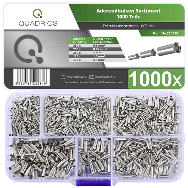 The Quadrios 22C485 Ferrule set includes 1000 uninsulated ferrules ideal for electrical connections. These ferrules are used to crimp and secure wire ends, ensuring reliable and efficient conductivity. Suitable for various electrical and industrial applications where insulation is not required.