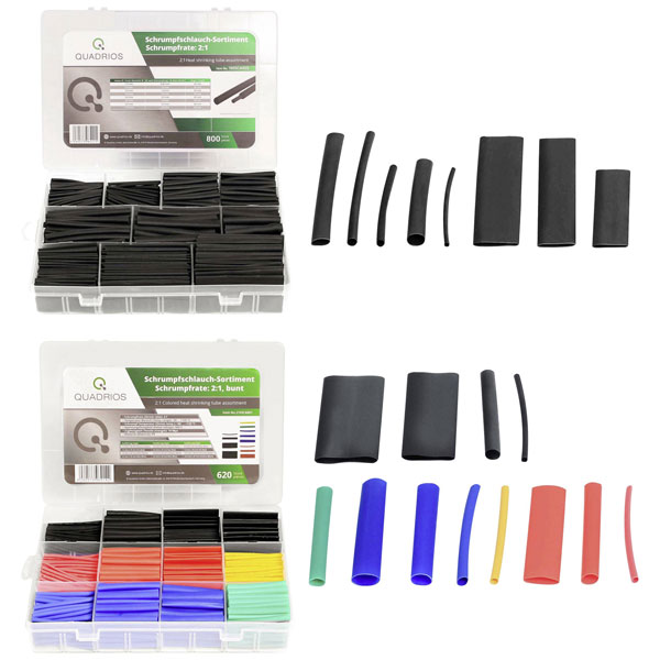 The Quadrios 22CA142 Heatshrink set includes a selection of black, red, yellow, blue, and green heatshrink tubes. This set features a 2:1 shrink ratio, ideal for securing and insulating electrical connections. It is typically used in electronics, automotive wiring, and various DIY projects.