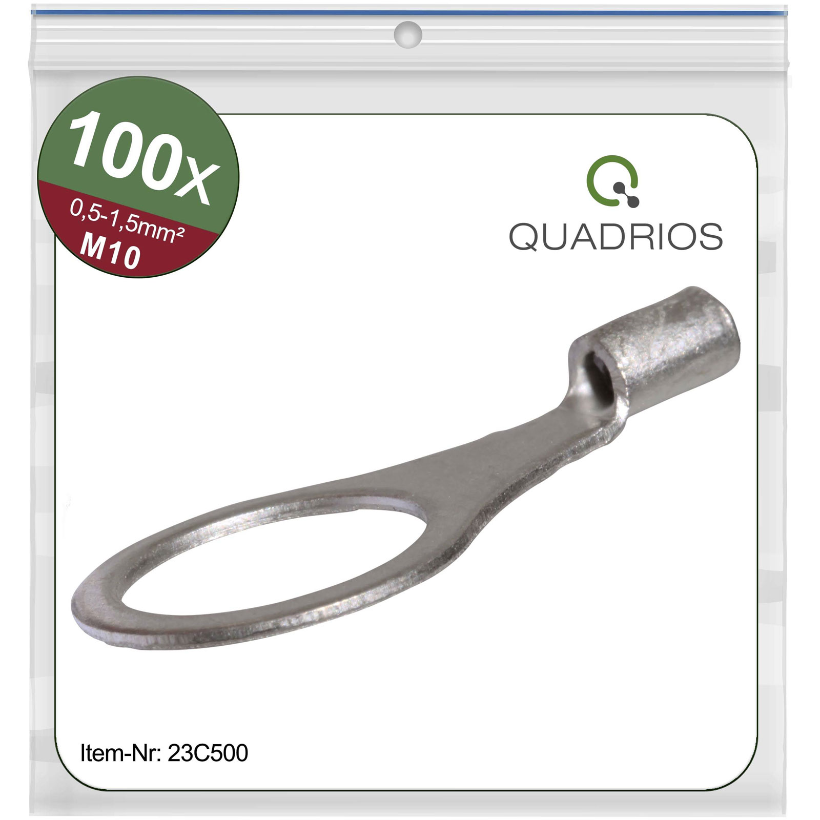 The Quadrios 23C500 ring terminal, with a cross section of up to 1.5 mm² and a hole diameter of 10.5 mm, is a robust, solder-free connector. These non-insulated crimp connectors are ideal for automotive and car applications. Typically used in electrical systems, they come in a package containing 100 pieces.