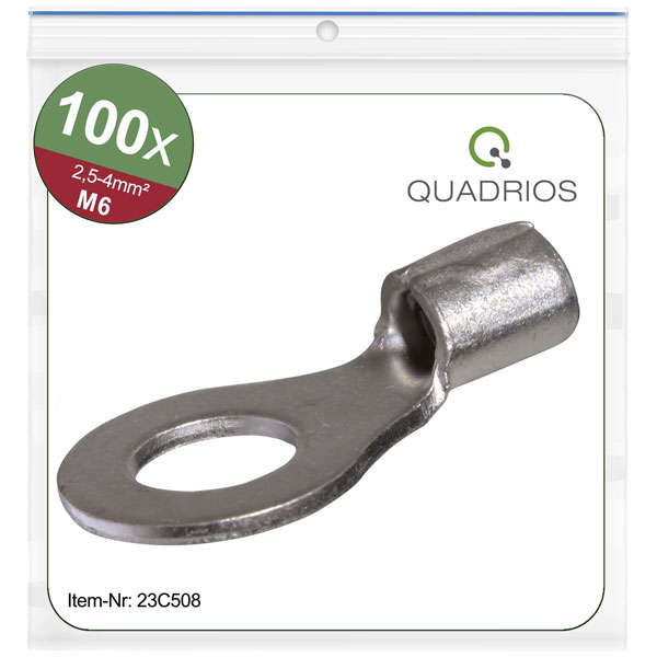 Quadrios 23C508 ring terminal features a cross-section of up to 4 mm² and a hole diameter of 6.5 mm, designed without insulation. This automotive crimp terminal is ideal for secure, solder-free connections in vehicle electrical systems. The pack contains 100 pieces, making it suitable for both professional and personal car wiring projects.