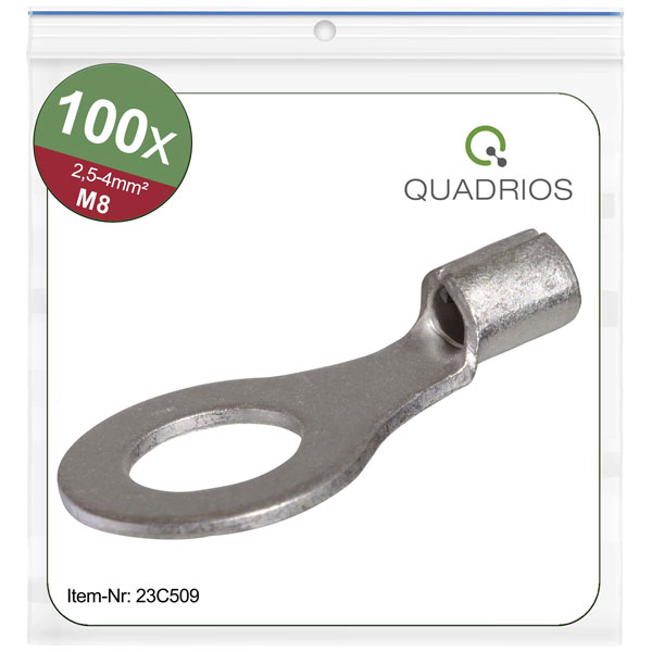 The Quadrios 23C509 ring terminal is a non-insulated crimp connector with a cross-section capacity of up to 4 mm² and an 8.5 mm hole diameter. Suitable for automotive and car applications, these M8 ring terminals offer a solder-free solution for secure wiring connections. With 100 pieces included, this product is ideal for various electrical and mechanical tasks requiring reliable ring terminal connections.