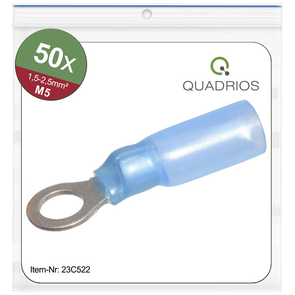 The Quadrios 23C522 ring terminal is a partially insulated, solder-free connector, available in blue, suitable for wire cross-sections up to 2.5 mm². It features a 5.3 mm hole diameter, ideal for automotive and car crimp terminal applications. These connectors, supplied in packs of 50, ensure reliable electrical connections in various installations.