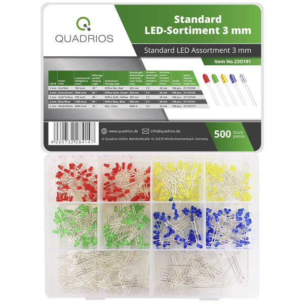 Quadrios 23O191 LED set Red Green Yellow Blue White 3mm 20mA Wired LEDs