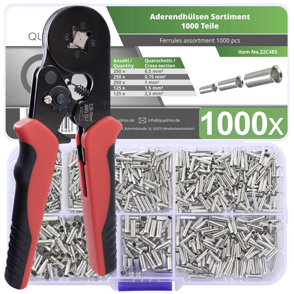 The Quadrios 23T034 Ferrule set includes uninsulated ferrules for crimping applications. This set is ideal for achieving secure electrical connections in projects that require reliability without insulation. Common uses include wiring tasks in electrical installations and maintenance.