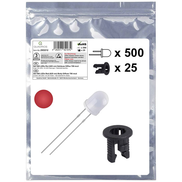 Quadrios 25O212 is an LED set featuring a red circular LED with a diameter of 3 mm. The LED emits a luminous intensity of 700 millicandela and operates at a forward current of 20 milliamperes with a forward voltage of 2.0 volts. This LED set is engineered for precise applications where compact, efficient red light sources are required, such as in electronic indicators, status display systems, and low-power lighting solutions. The design ensures optimal performance in various engineering environments, including circuit prototyping, telecommunications equipment, and control panels.
