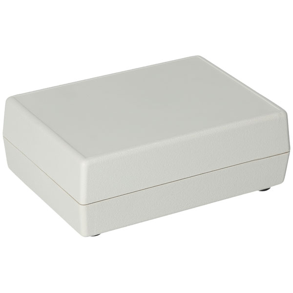 A grey ABS plastic enclosure, 111 x 83 x 38mm, ideal for use as a case for instruments, computer accessories, remote actuators, audio and video controls and security systems.