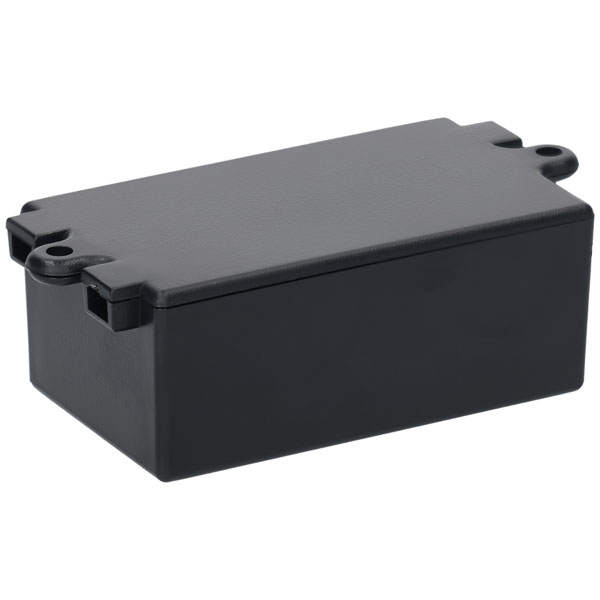 A black, high impact ABS utility enclosure with cable outlets, suited to demanding OEM applications. The box incorporates a close fitting interlocking lid.